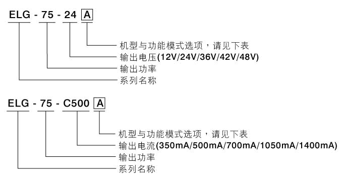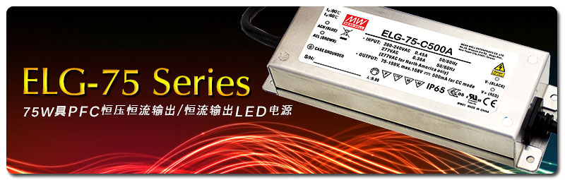 ELG-75:恒压(C.V.)+恒流(C.C.)输出;ELG-75-C:恒流(C.C.)输出